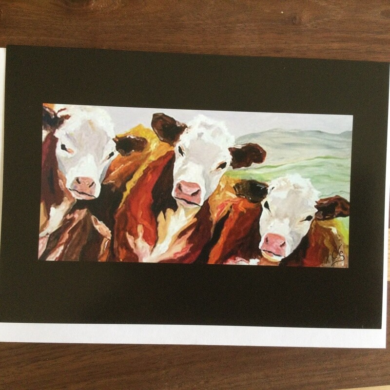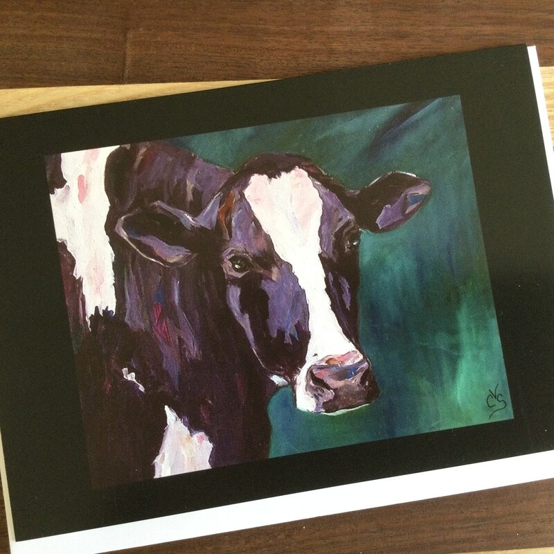 Once upon a time, our friend & local painter Carol van Steeter painted a delightful series of cow paintings. Lucky for us, she also had note cards made!